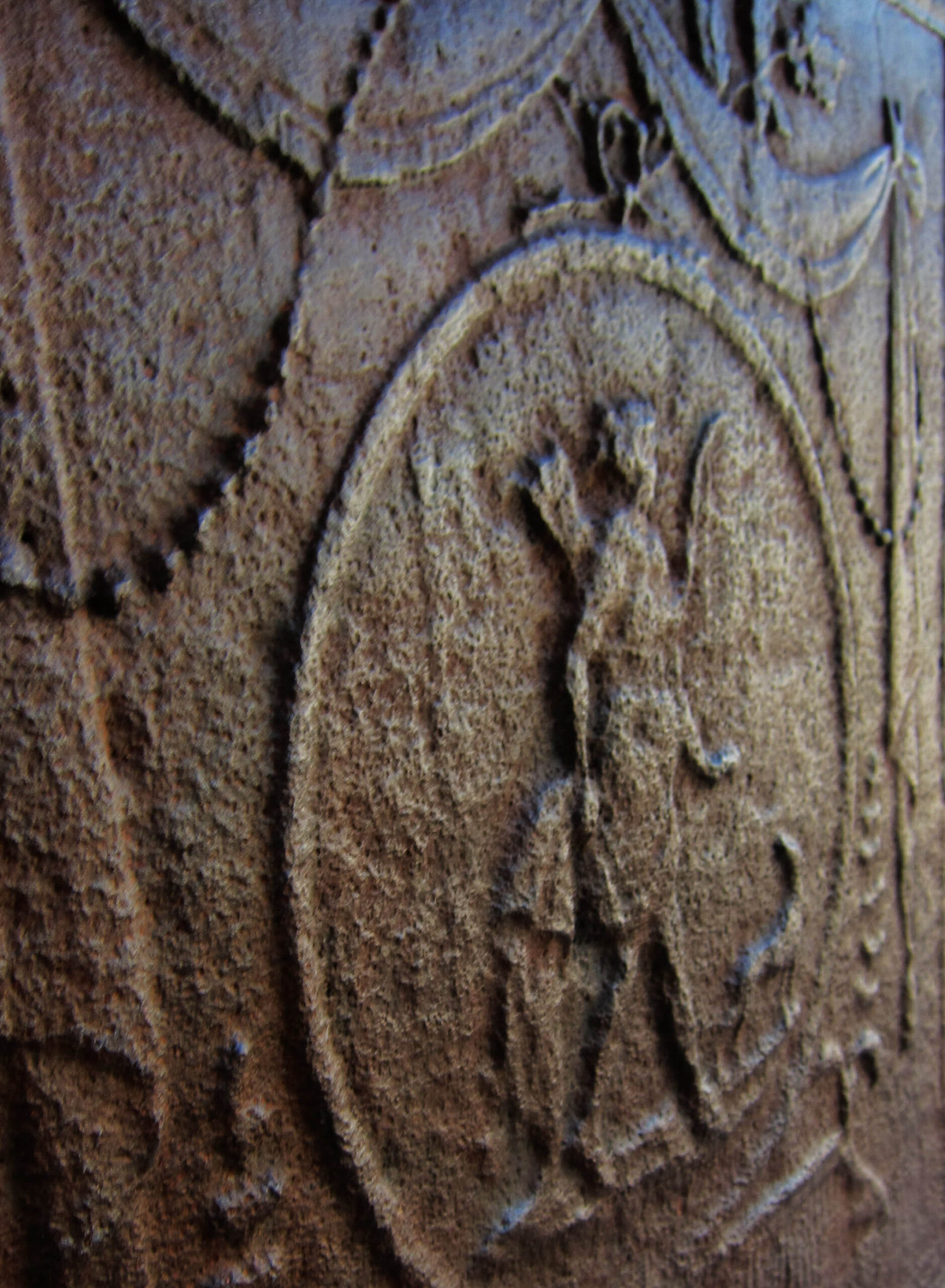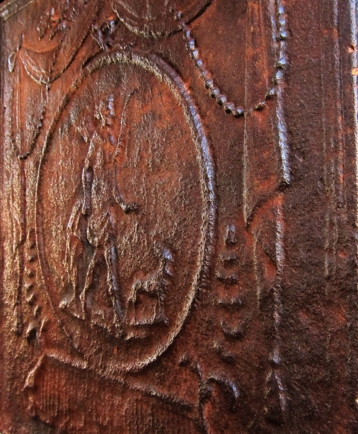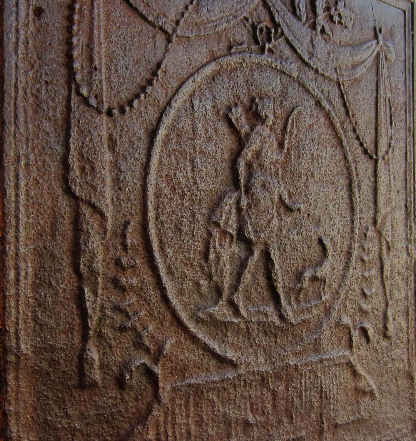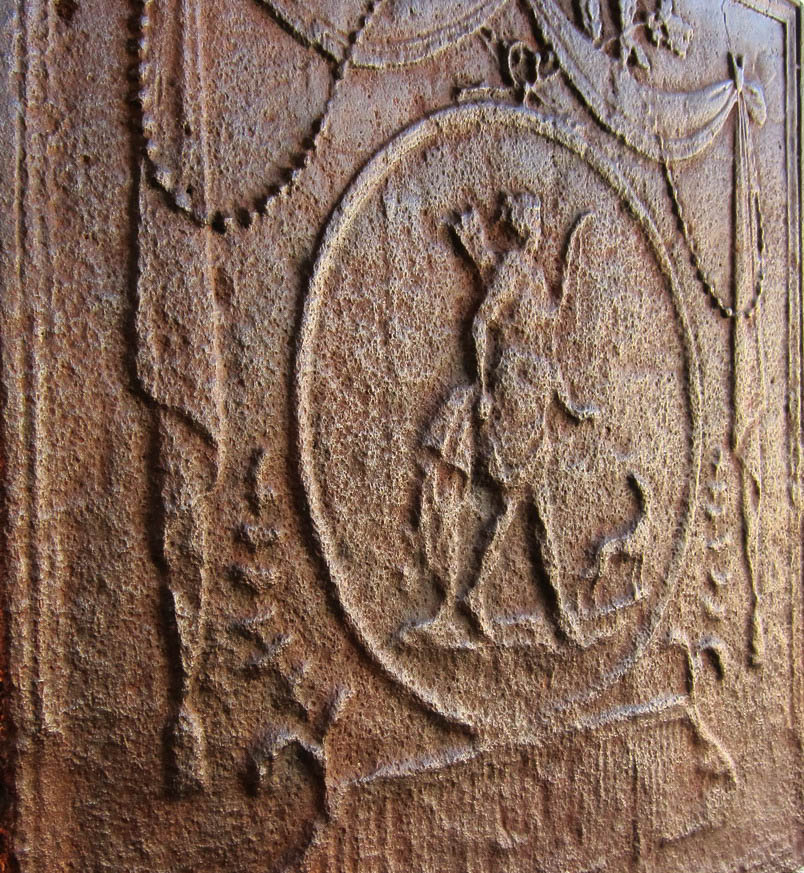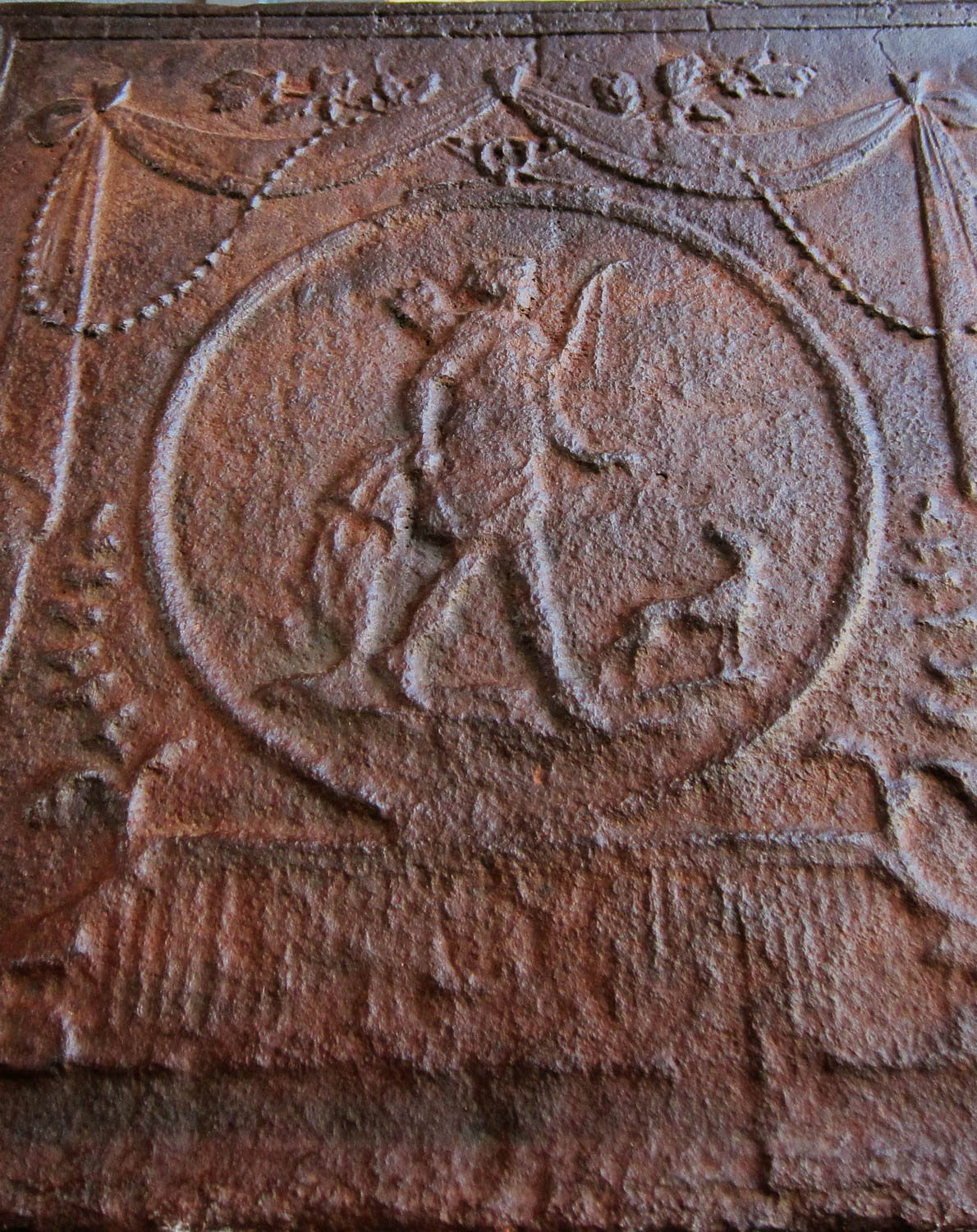 This cast iron fireback is from the 17th century, and features a man and dog.