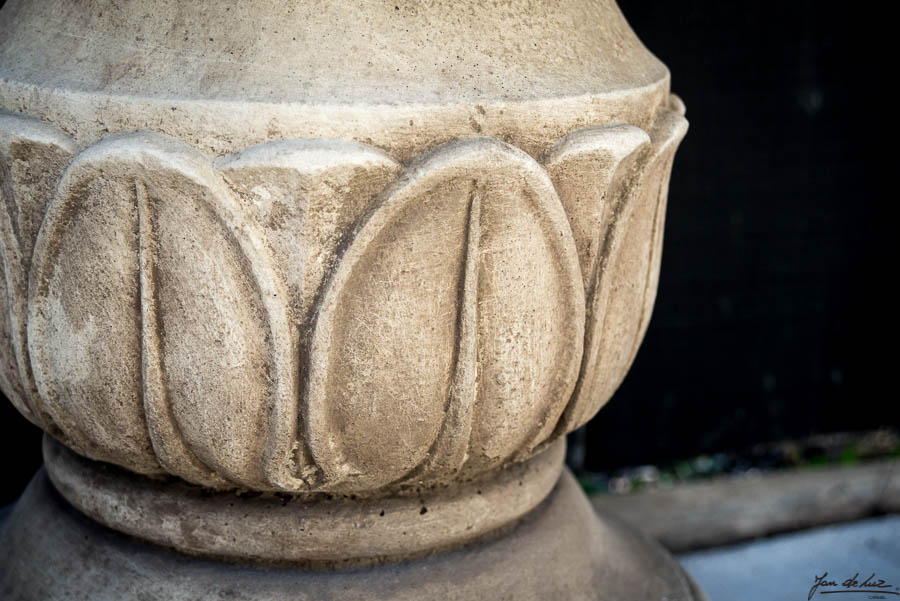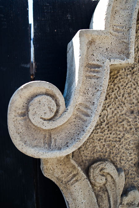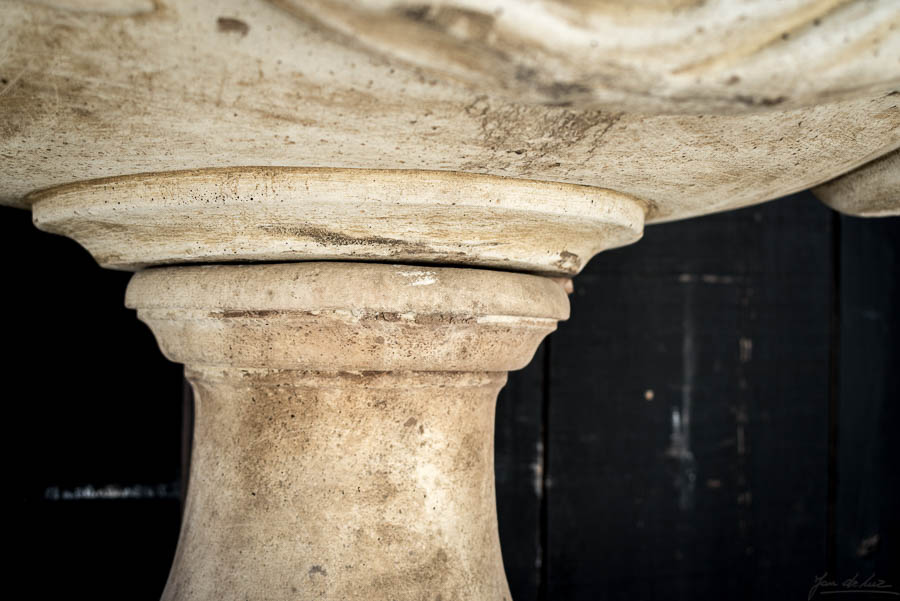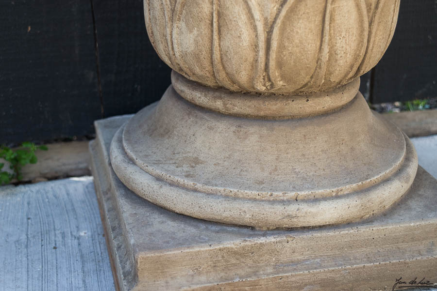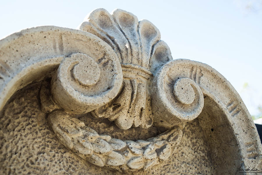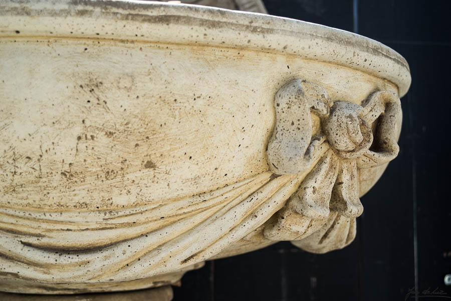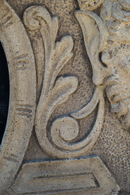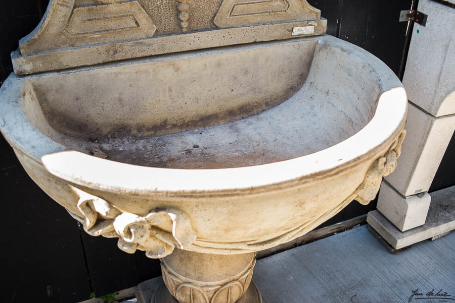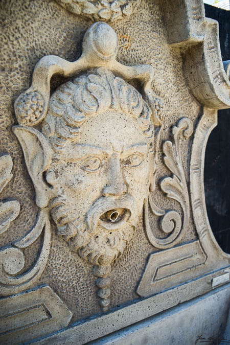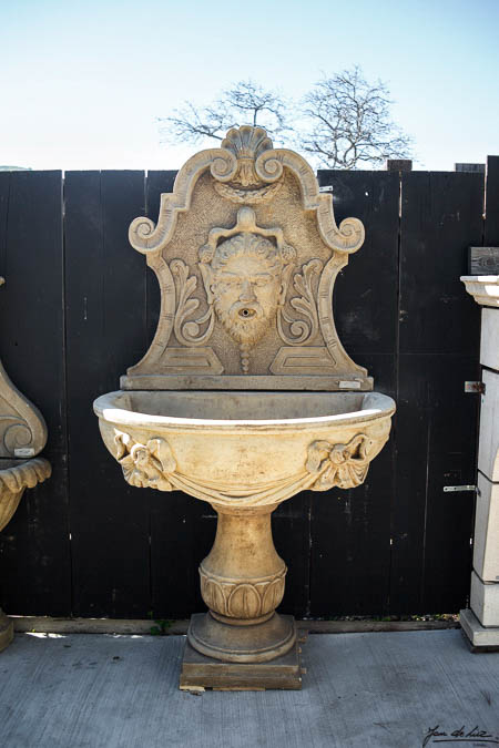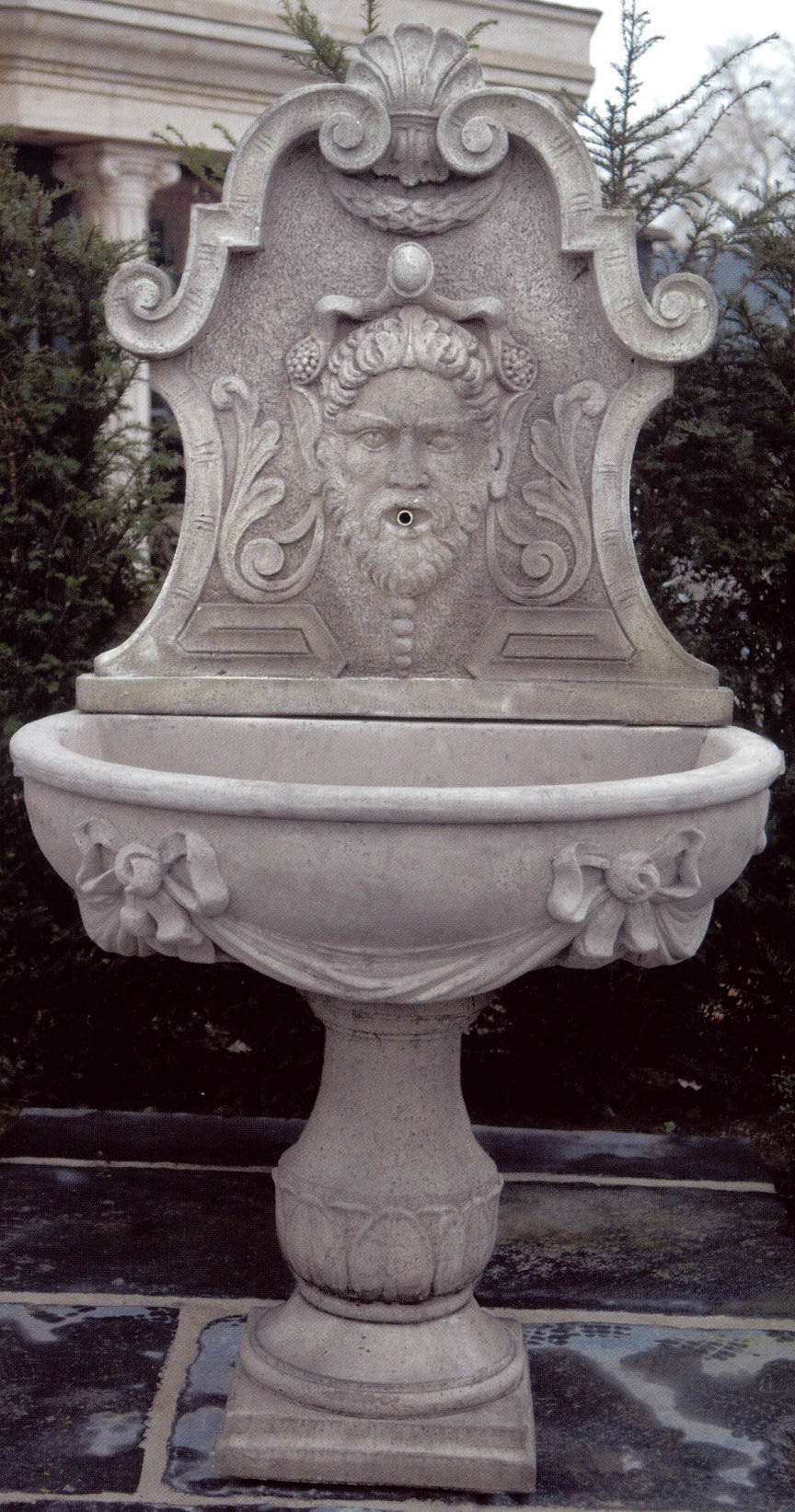 This is a unique style wall fountain, of cast stone, featuring the face of the Greek God Pan. Pan was connected to shepherds and flocks, hunting, and so, was related to fertility and springtime — making him a perfect spring lush garden fountain. There are fat leaf-like wrapping at the base of the fountain, with a sash and bow along the side of the basin. Then the fountain back has an ornate trimming with leafs almost flowing the head of Pan. And the shape above his head is like a symbolic wreath of power, or circle of divinity, noting his powerful past.